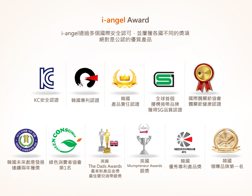 i-angel 是韓國的嬰兒代表品牌,並且營運 26 年。從 2009 年就開始進入日本市場,然後一直走向世界。如今超過 30 個國家售賣 i-angel 腰櫈揹帶。 i-angel 獲得美國髖關節協會「髖關節健康認證」的腰櫈揹帶。 i-angel 一直研發技術和確保質量,具有穩定性和卓越的品質。並會不斷提升競爭力,開拓世界市場視野。