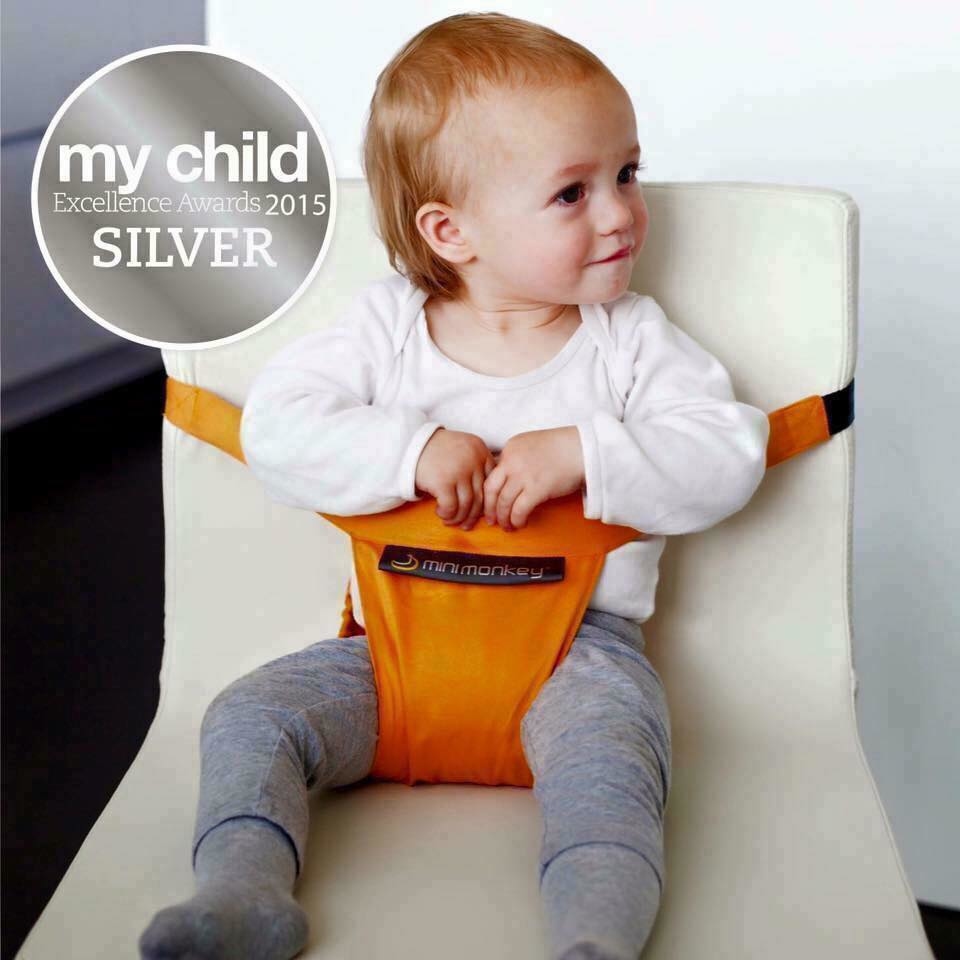 Minichair 嬰兒便攜座椅安全帶:其最大特色是適用於「任何有椅背」的椅子,而且非常輕巧,無論到餐廳或親友家吃飯,只要用三點式安全扣緊扣於椅背,即可成為一張非常安全的流動 high chair。