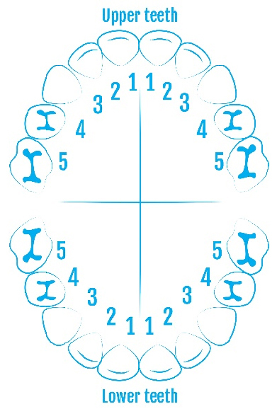 寶寶的乳牙大多會在6-8個月大時萌發,不同體質萌發的時間可能會有提早或是延遲的現象,都是正常的。下圖為寶寶長牙順序,其中萌發最早的為門齒而最晚萌發的是第二臼齒,一般乳臼齒會在2歲左右開始長出,3歲之前長全整副乳牙20顆。但要注意的是這些數據是平均值,因此存在個人差異,若真的晚了非常多(6個月~1年),就建議請牙醫師檢查是否有其他原因造成延遲萌發,在臨床上,會比較需要注意的是對側牙(下圖2號)的延遲生長,這時也建議提早檢查是否有萌發障礙。