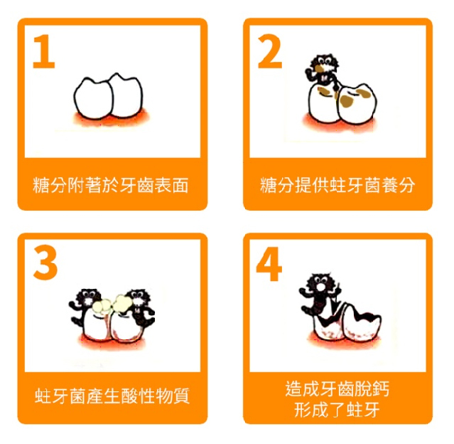 孩子在喝完奶或吃完含醣食物後,部分醣分經過分解會殘留在口腔,附著於牙齒表面,而這些醣分恰好提供了口中蛀牙菌(變性鏈球菌, S. Mutans)養分,不斷化學反應產生酸,使口腔環境在餐後會從pH 6.8急劇下降到pH 5.5,開始酸蝕琺瑯質(主要成分是氫氧基磷灰石),造成牙齒脫鈣,當大面積的琺瑯質遭到破壞便形成了蛀牙(如下圖所示)。