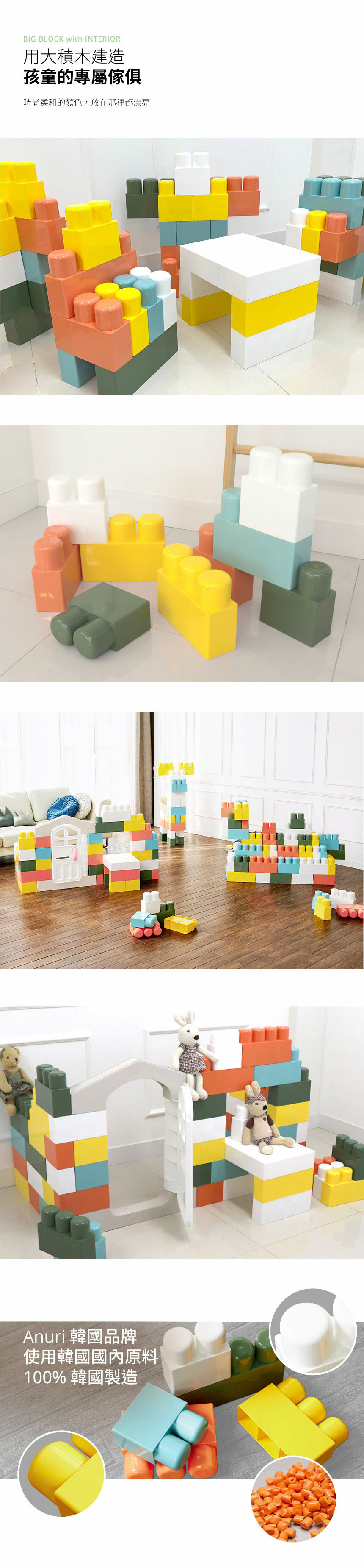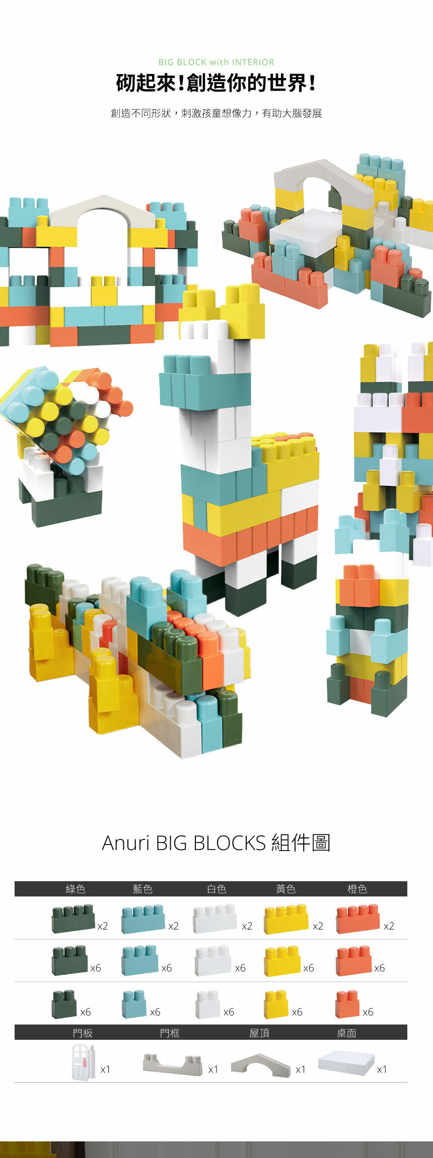 Anuri 我的第一個間屋Jumbo 積木組配有門,屋頂和桌子。在這麼小的年齡,您的孩子現在可以擁有自己的第一套房產。超大且聯鎖的塊具有光滑的圓形邊緣,可確保安全的遊戲時間。