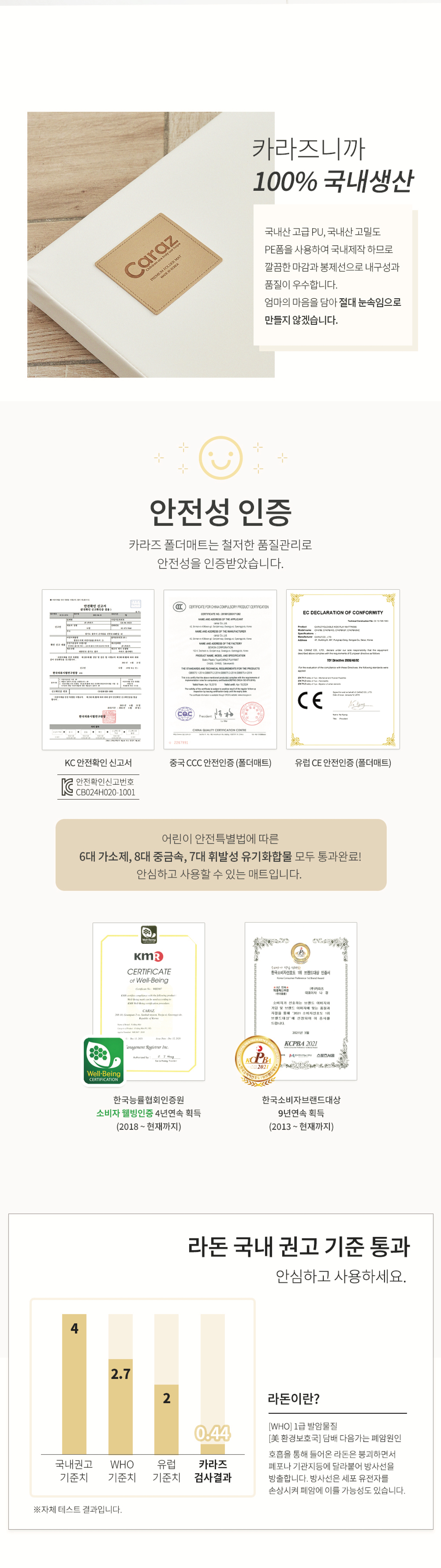 內層: 由8層高密度PE foam組成。不使用化學黏合劑,而使用熱溶合而成,在高溫也不會產生有害物質,使家長放心使用。