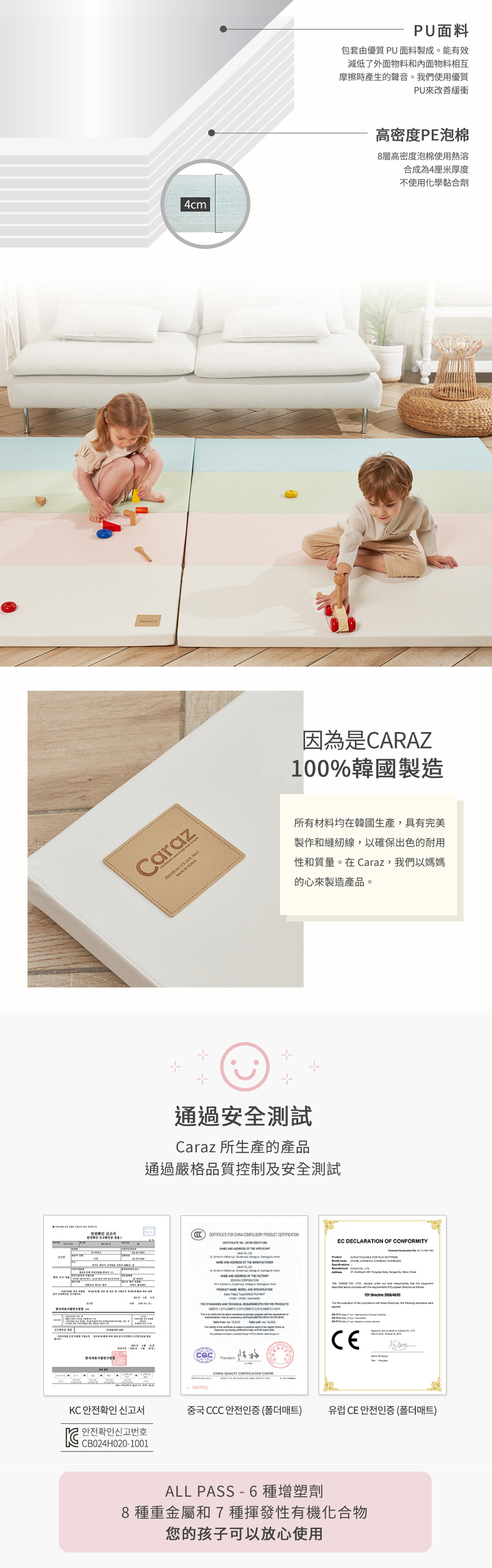 內層: 由8層高密度PE foam組成。不使用化學黏合劑,而使用熱溶合而成,在高溫也不會產生有害物質,使家長放心使用。